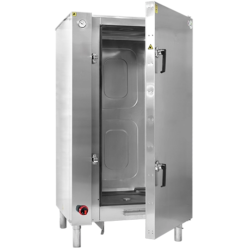 پس از اتمام مرحله دان گیری برنج (آبکشی ) ، برنج ها به ظروف بن ماری پانچ منتقل شده و در طبقات هایژنیک فر دمکن قرار می گیرند.شارژ بن ماری دستگاه ممکن است به صورت دستی و یا توسط ترولی های حمل بن ماری صورت پذیرد .پس از انتقال برنج ها به درون دستگاه درب فر بسته شده تا دما ، رطوبت و فشار داخل کابین به سرعت بالا رود .آب مورد نیاز جهت تولید بخار ، بصورت اتوماتیک از لوله های آب شهری تامین می شود .دمای داخل فر دمکن ایستاده برنج توسط گیج نصب شده بر روی درب قابل رویت برای آشپز می باشد .مدت زمان دم کشیدن برنج در این دستگاه متناسب با نوع برنج ، حجم برنج موجود در دستگاه و …. متفاوت هست